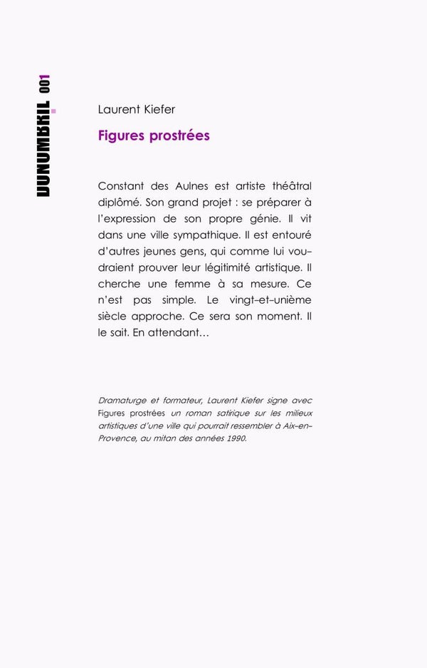 Roman satirique sur les milieux artistiques provinciaux, l’action de Figures prostrées se déroule dans une ville ressemblant fort à Aix-en-Provence, au mitan des années 1990. Constant des Aulnes, le narrateur, est un metteur en scène de théâtre aux obsessions mythomanes. Son narcissisme lui fait porter sur son entourage artistique, et sur les femmes en particulier, un regard proprement odieux. Il cherche l’amour sans le désirer, il cherche à créer sans savoir par où commencer. Et il PENSE…